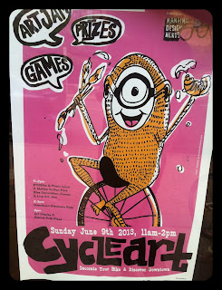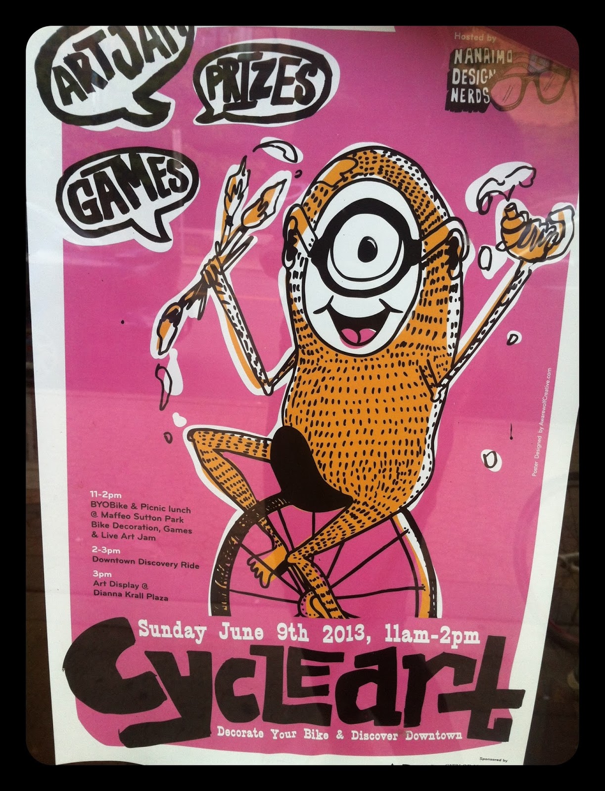 On Sunday June 9th some fantastic organizers from the Nanaimo Design Nerds and a graphic artist team from Awarewolf Creative organized “Cycleart”.  It was great, we met up at Maffeo Sutton waterfront park and painted a mural, decorated our bikes and pedalled through downtown on a scavenger hunt to the downtown businesses and ended at the Nanaimo Art Gallery.  We had a great day at this family event and we’re now keen to plan a neighbourhood bike parade on Gabriola. To top it off we won some fantastic prizes (thank you New York Style PizzaCayo Fashions) and a huge thanks to all those that made this event happen.