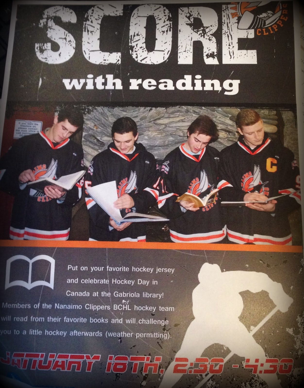 I’m always amazed at the number of great things going on at the Gabriola Branch of the Vancouver Island Regional Library. They have a great afternoon lined up on Sat, Jan 18 from 2:30-4:30 to celebrate Hockey Day in Canada. They are bringing over members of the Clippers Hockey team to read from their favourite books and may challenge our island players to a little hockey after, game on!